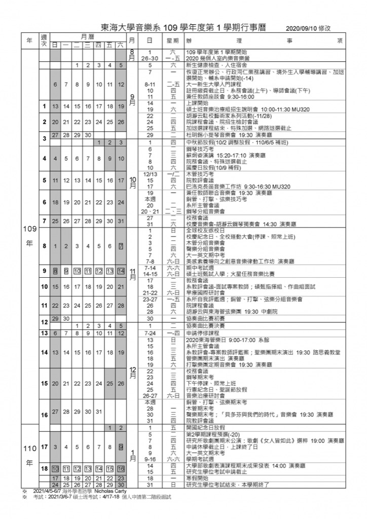 東海大學音樂學系---109-1 音樂系行事曆 (0910更新)