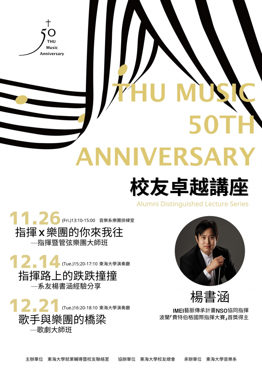 110年校友卓越講座,音樂系邀請到曾獲第10屆波蘭「費特柏格國際指揮大賽」首獎的楊書涵系友來為學弟妹進行三場講座。講座時間地點分別為: