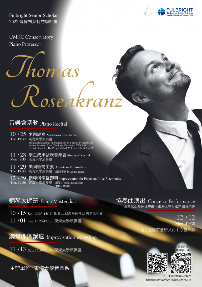 美國密蘇里大學堪薩斯分校音樂系 (UMKC Conservatory, University of Missouri - Kansas City) 鋼琴教授 Thomas Rosenkranz 獲傅爾布萊特資深學者獎勵 (Fulbright Senior Scholar),2022年9月至2023年1月於本系擔任鋼琴客座教授,將舉辦一系列活動,歡迎大家共襄盛舉。