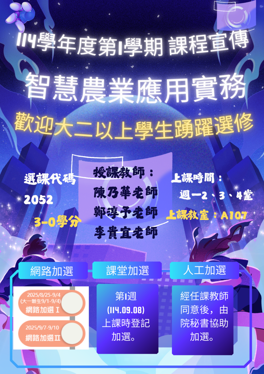 - 【農業暨健康學院】114學年度設立「智慧農業微學分學程」、「智慧農業實務應用課程」,歡迎踴躍申請修課
