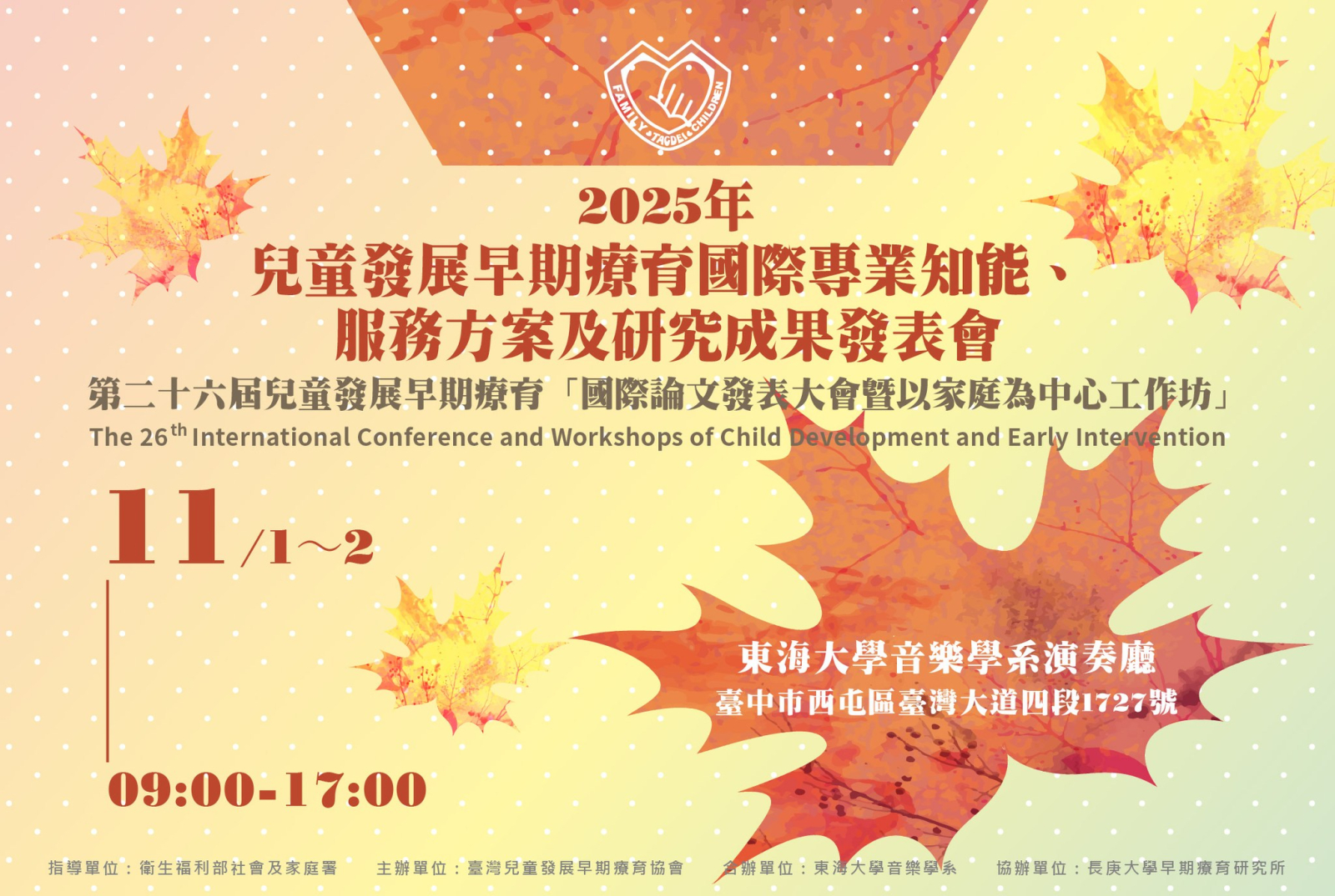 東海大學音樂學系--其他公告-第二十六屆兒童發展早期療育「國際論文發表大會暨以家庭為中心工作坊」將於11/1盛大舉行