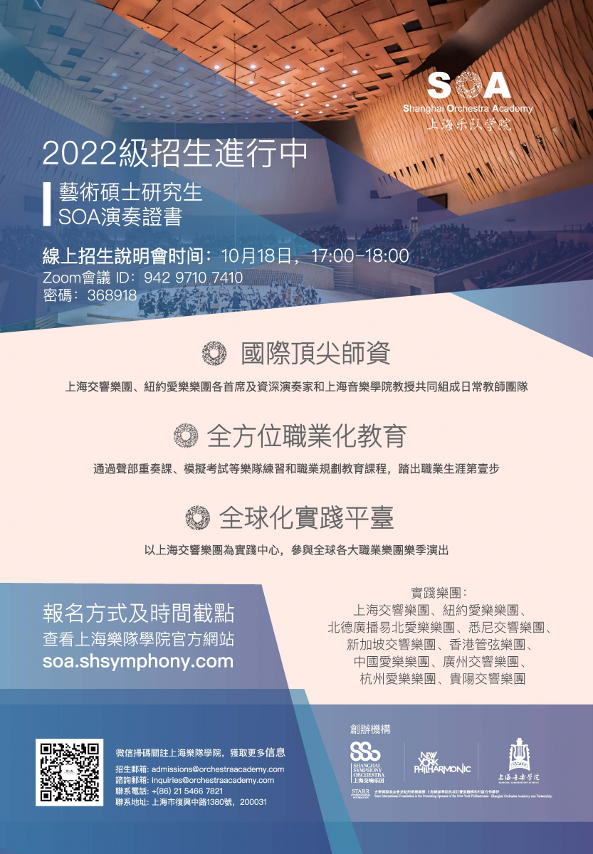 上海樂隊學院現已開放2022級招生,臺灣的同學們可以在我們官網soa.shsymphony.com上瞭解到招考曲目並下載曲譜。