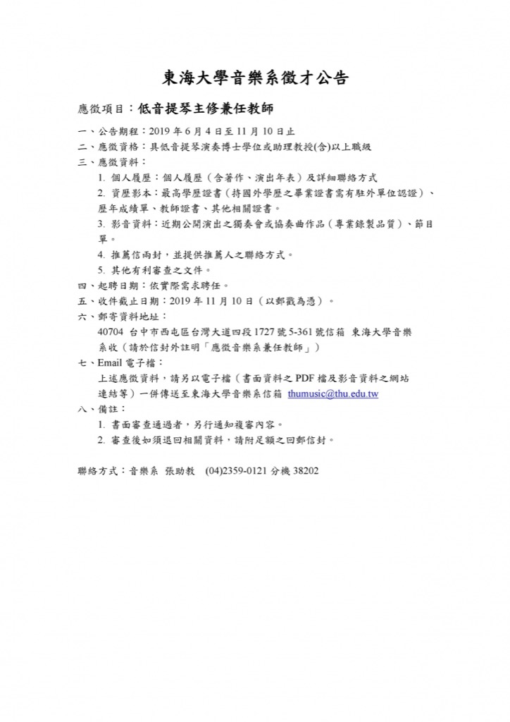 東海大學音樂學系---東海音樂系誠徵低音提琴兼任教師 收件至11/10